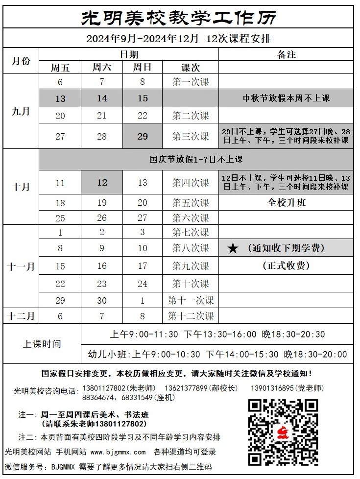 各位学生、家长好: 以下为北京市西城区光明美术培训学校2024年9月至12月校历。请各位...